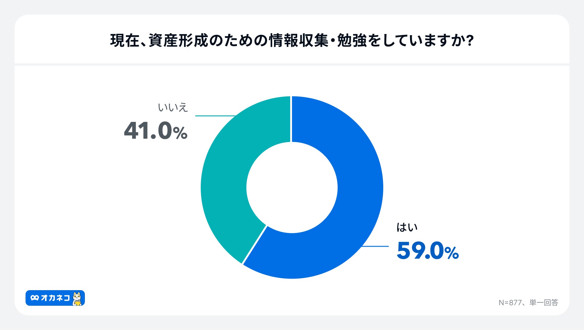 調査対象者に「現在、資産形成のための情報収集・勉強をしていますか」と質問したところ、はい59.0%、いいえ41.0%となりました。
