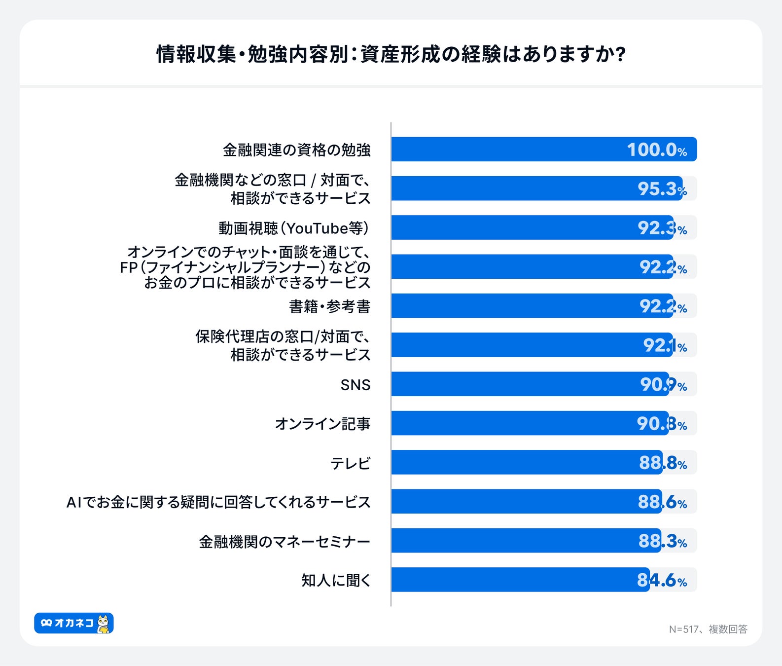また、同回答者に「資産形成の経験はありますか」と質問したところ、金融関連の資格の勉強をしている方は100%、金融機関などの窓口/対面で相談ができるサービスを利用している方は95.3%と続き、資格取得の学びを実践に活かしている方や、専門家に相談し投資を進めていきたい方が多いことが伺えました。
