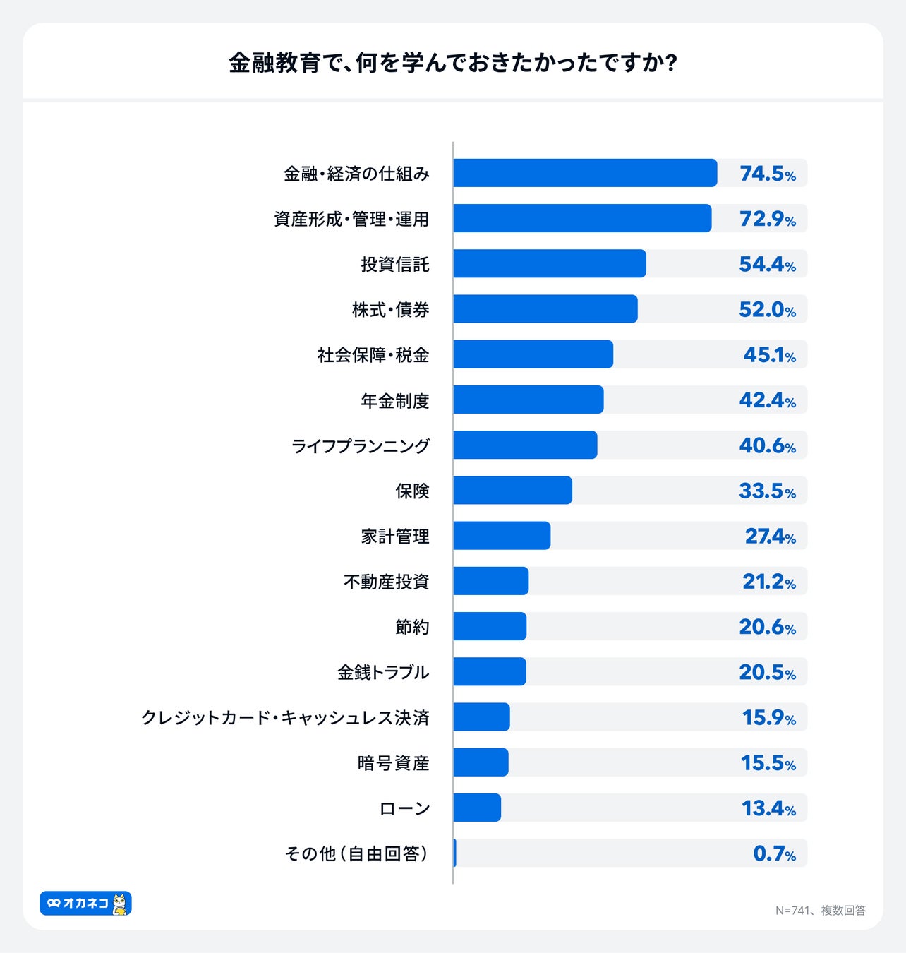 同回答者に学びたかった内容を質問すると、金融・経済の仕組み74.5%、資産形成・管理・運用72.9%の順に続き、原理・原則を学んだうえで、実践していきたい方が多いことがわかります。