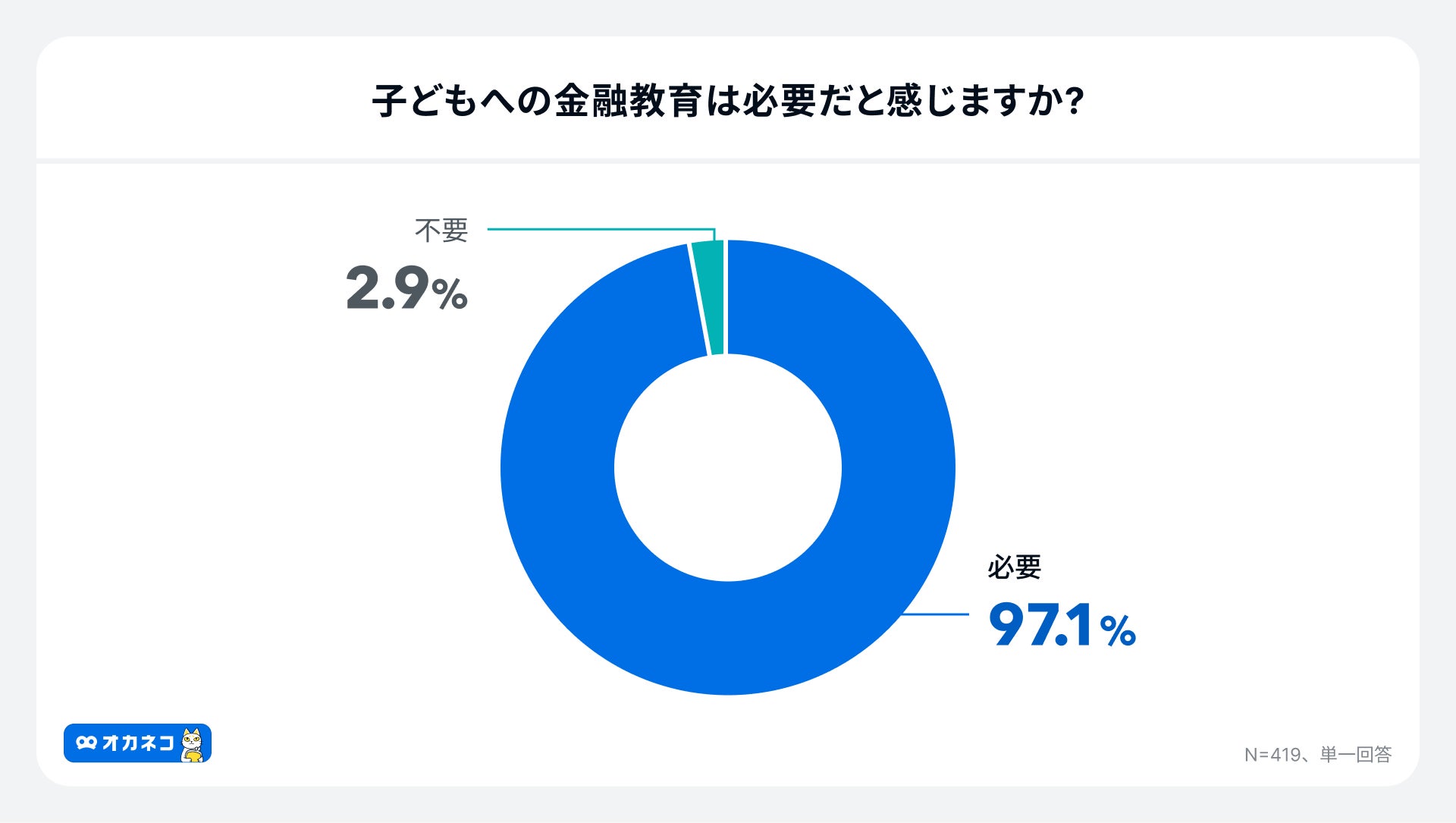 回答者の中から子どもがいらっしゃる方に「子どもへの金融教育は必要だと感じますか」と質問したところ、必要97.1%、不要2.9%となり、ほぼすべての方が子どもに金融教育が必要と回答しました。