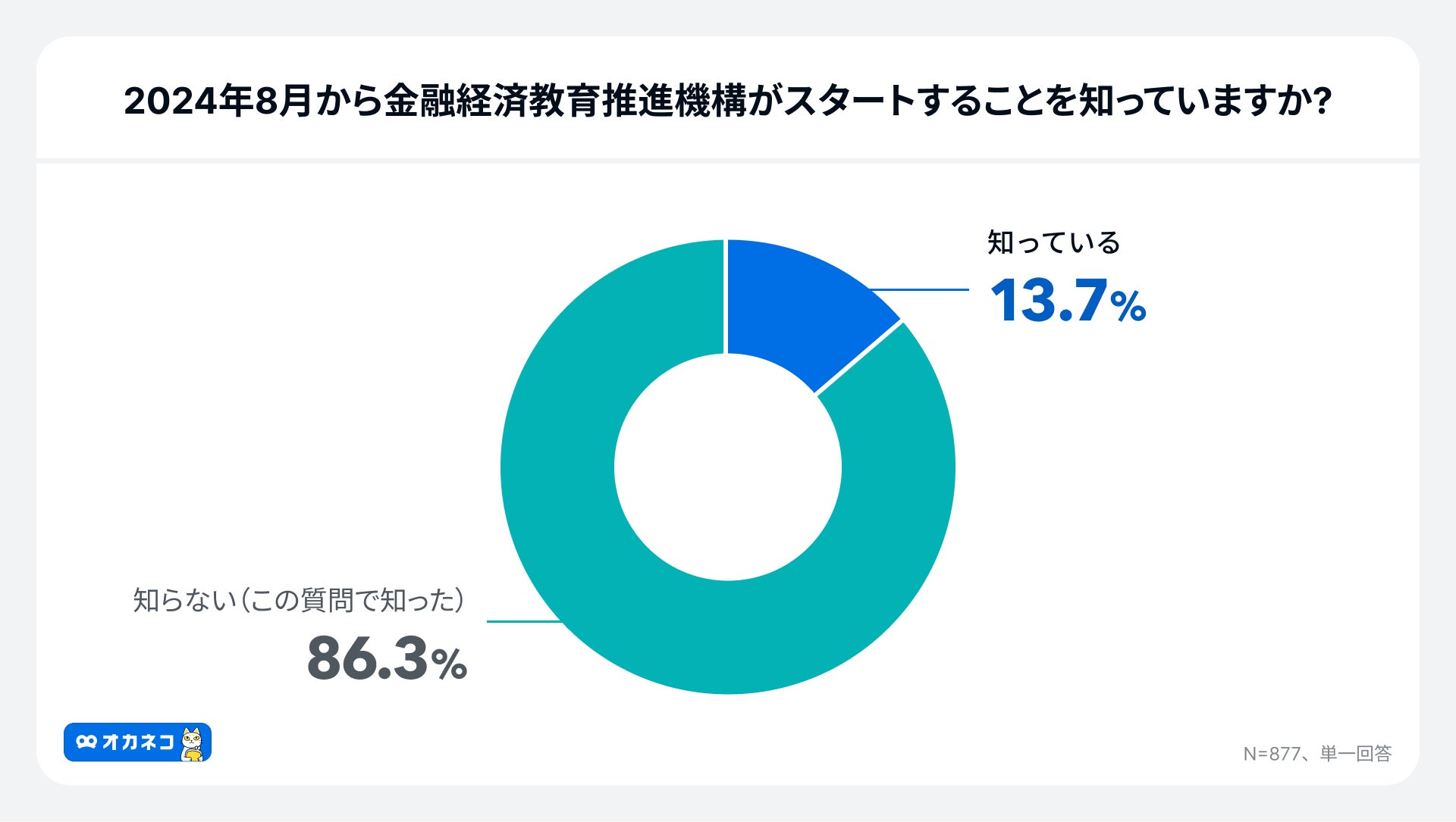 調査対象者に「2024年8月から金融経済教育推進機構が本格的にスタートすることを知っていますか」と質問したところ、知っている13.7%、知らない86.3%となり、これから認知が普及する余地があることがわかりました。