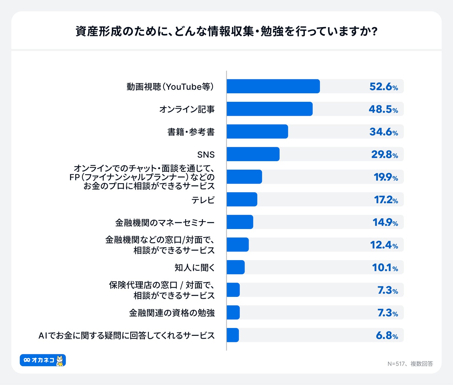 資産形成のための情報収集・勉強をしている方に「どんな情報収集・勉強を行っていますか」と質問したところ、動画視聴(YouTube等)52.6%、オンライン記事48.5%の順に多い結果となりました。