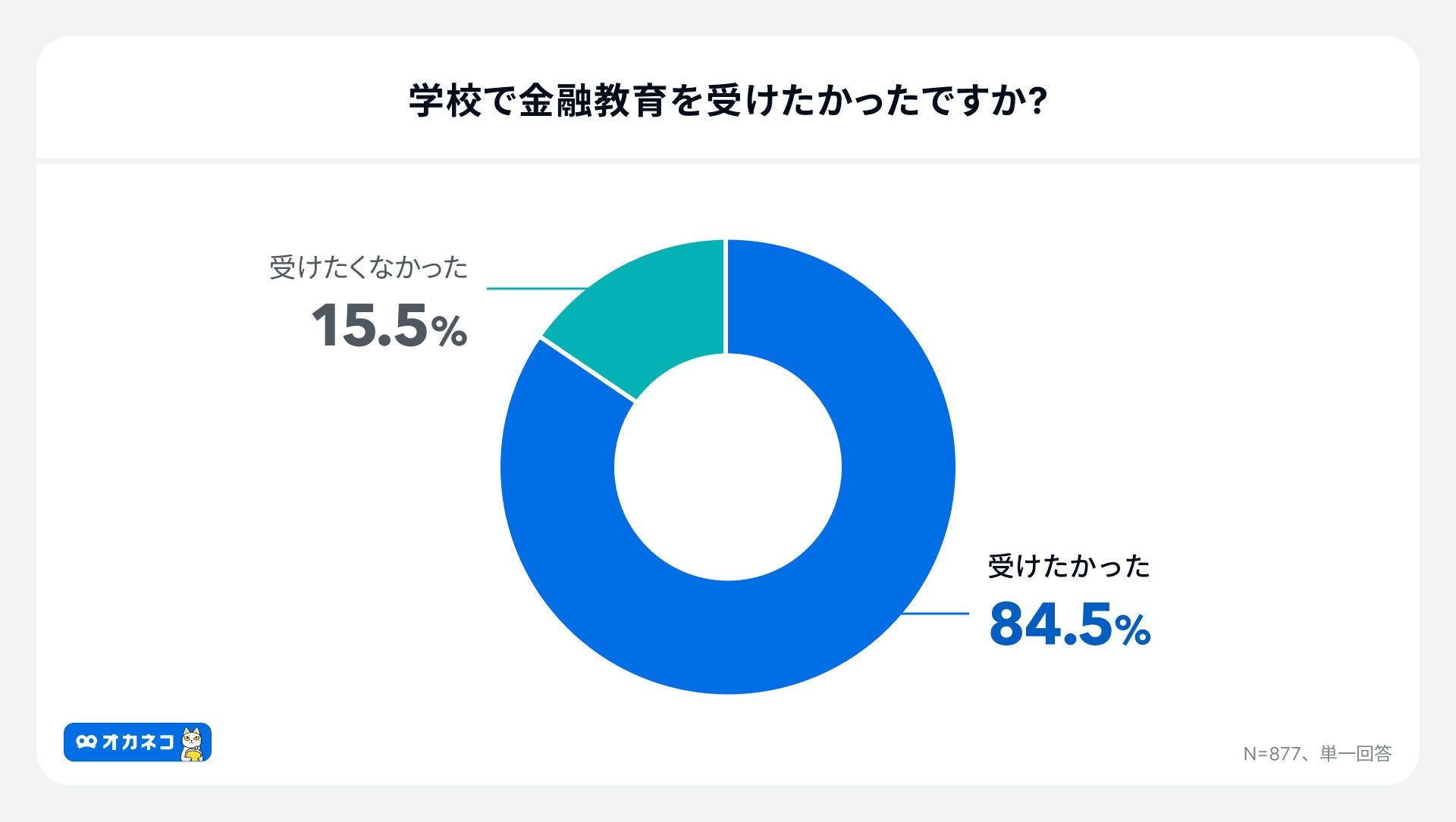 回答者に、2022年度より高等学校にて金融教育が義務化されたことを受け「学校で金融教育を受けたかったですか」と質問したところ、受けたかった84.5%、受けたくなかった15.5%となり、8割を超える方が金融教育を受けたかったと回答しました。