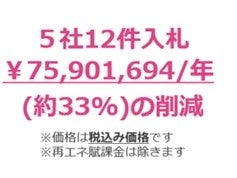 今回、公共施設38施設を対象にリバースオークションを行った結果、計5社から12件の入札があり、再エネ化だけでなくコスト削減も実現することができました。