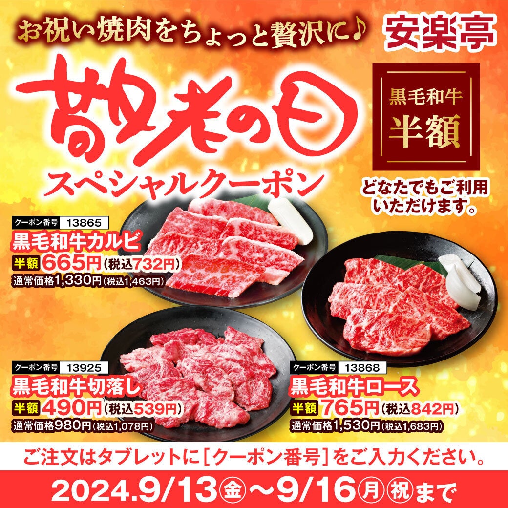 9月16日は敬老の日。安楽亭では「敬老の日」のお祝い焼肉をおトクに、ちょっと贅沢におたのしみいただきたいという想いから9月13日(金)~9月16日(月・祝)の期間、敬老の日スペシャルクーポンを配信します。