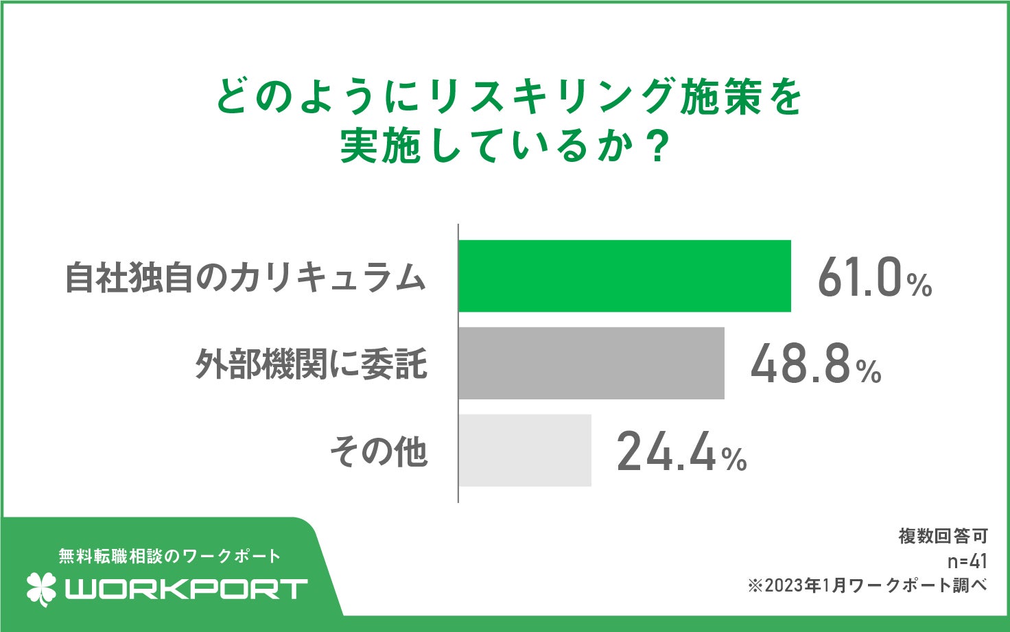 まず、リスキリング施策をどのように実施しているか聞いたところ、「自社独自のカリキュラム」が61.0%と「外部機関に委託」の48.8%を上回りました。