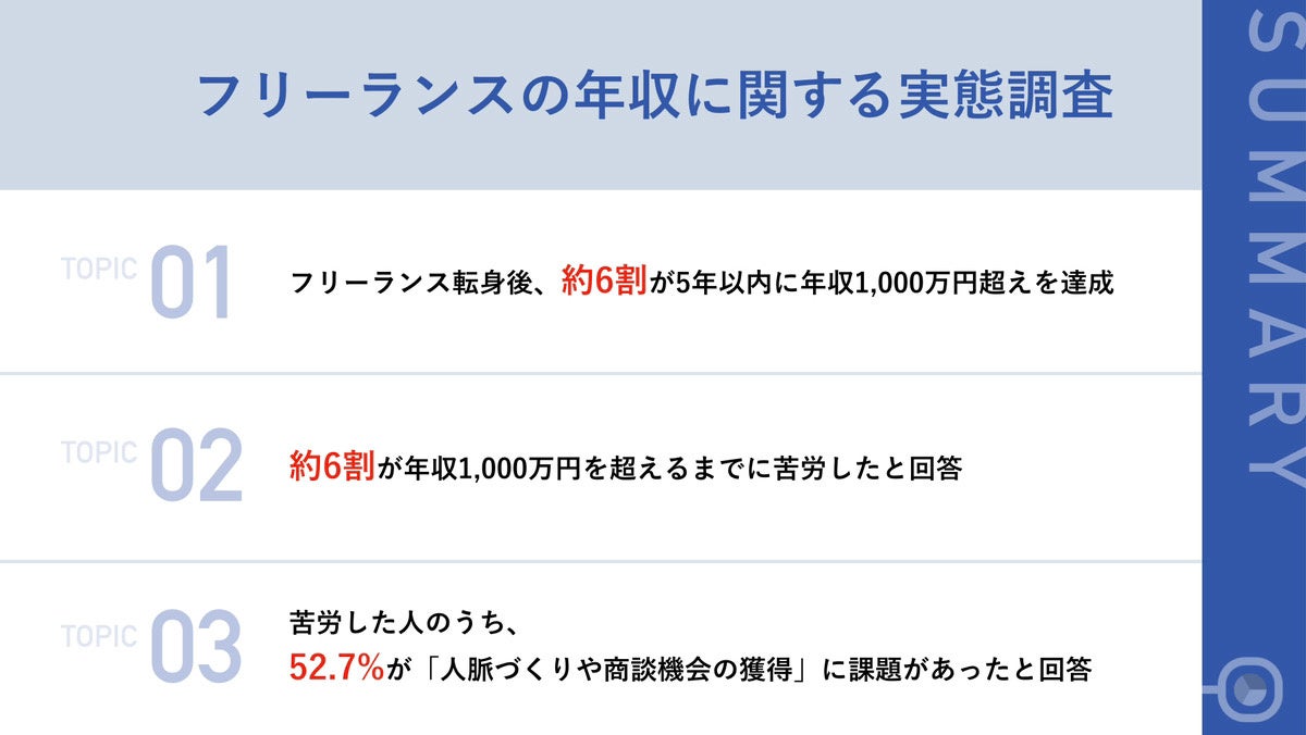 フリーランス転身後、約6割が「5年以内に年収1,000万円を超えた」と回答
