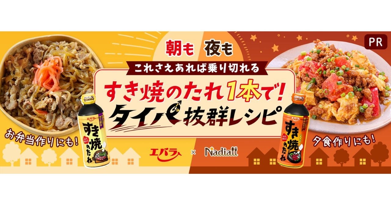 Nadia株式会社(東京都港区/代表取締役社長 葛城嘉紀 以下「Nadia」)とエバラ食品工業株式会社(神奈川県横浜市/代表取締役社長 森村 剛士 以下「エバラ食品」)がタイアップし、「すき焼のたれ」の消費拡大を目的に、特別企画ページ【すき焼のたれ1本で!タイパ抜群レシピ】を公開いたします。