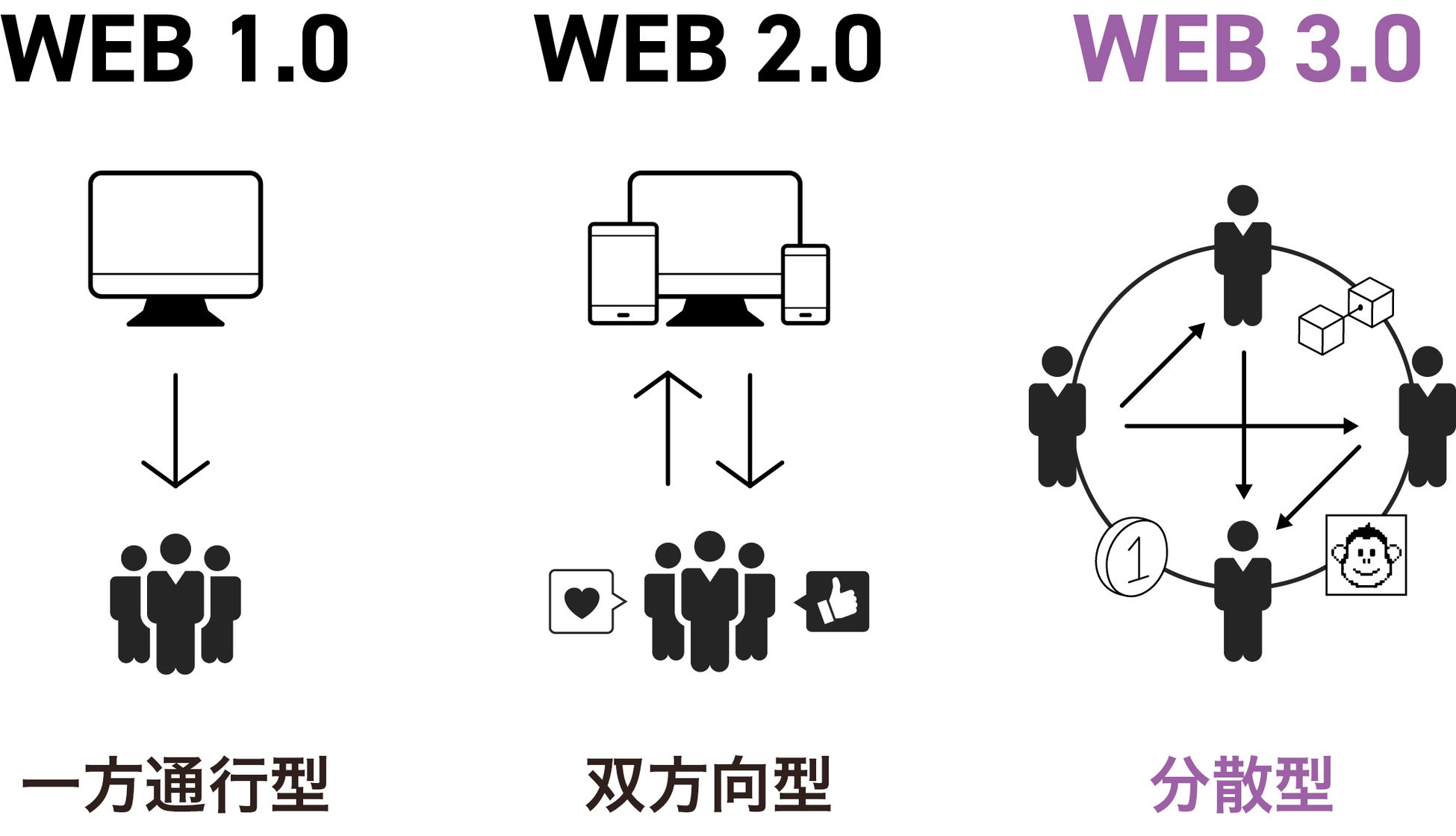 また、DAOなどでコミュニティを形成して、サービスに対して発言権を持ったり、会社の成長に対して影響を与えることもあり得ます。一方で、企業と顧客の接点を近くし、WEB2.0時代と比べ、本当に届けたい人たちに明確なアプローチができたり、継続的なコミュニケーションを取り続けることができるようになり、企業、ブランドのロイヤリティ向上に繋げることもできるようになります。