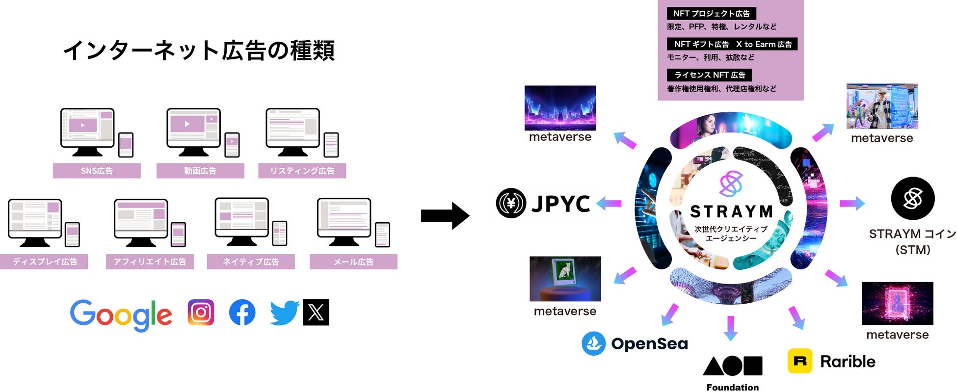 実社会とWEB3を繋ぐ架け橋として、パートナーが持っている価値を多角的視点から戦略的にアップデートさせたプロジェクトを組み立てます。またプラットフォーム「STRAYM(ストレイム)」を活用してマーケティングを行い、独自に構築したブロックチェーンプロトコルを更に洗練させていくことで、ユーザーの利便性を追求していく日本を軸にボーダレスに展開する次世代型クリエイティブエージェンシーです。