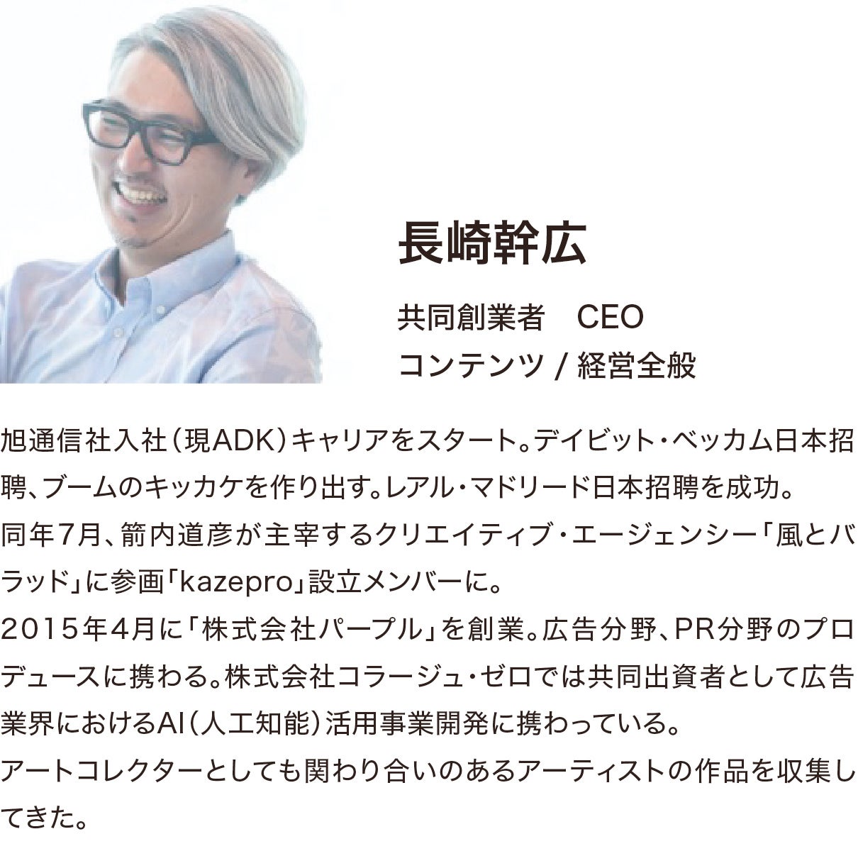 当社経営陣は、数々の広告賞やデザイン賞を受賞する箭内道彦率いるトップクリエイティブエージェンシー「風とロック」の創業メンバーとして参画してきた長崎幹広や、広告、映像分野から空間演出も手掛け非常に高い評価を得るクリエイティブユニット「Enlightenment」のヒロ杉山など、ラグジュアリー領域で世界のトップブランドや国内企業のグローバル展開の依頼、各都道府県と連携した地方創生支援プロジェクトやエンタメ施設のプロデュース、スポーツやアートなどの大規模イベントの開催などの実績を持ちチームと、WEB3に対応する次世代のクリエイターが所属しています。