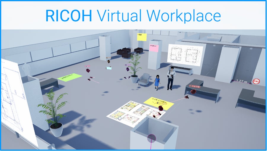 リコーバーチャルワークプレイスはバーチャル空間にBIM*などの3Dデータを簡単に再現し、その空間に多人数が同時にリモート接続することができるメタバース環境です。ユーザーが独力で空間の作成が可能であり、施主説明や設計者間での検討に活用することが可能です。また、空間内でのコミュニケーションを自在に行い、設計時の認識齟齬をなくし、合意形成を円滑に行うことが可能です。