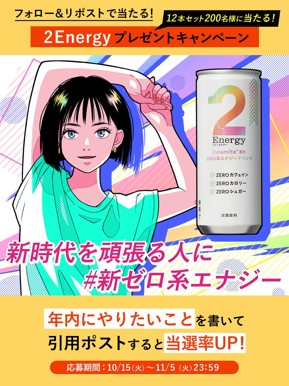 植物由来食品を展開する「2foods(トゥーフーズ)」を手掛ける、株式会社TWO(本社:東京都渋谷区/代表取締役CEO:東 義和/以下「TWO」)は、ゼロカフェイン※1・ゼロカロリー※2・ゼロシュガー※3の3つのゼロを実現したエナジードリンク「2Energy(トゥーエナジー)」を“新ゼロ系エナジー”※4としてリニューアルいたします。リニューアルを記念し、2foods公式Xにて、2024年10月15日(火)より「新時代を頑張る人に #新ゼロ系エナジー プレゼント」キャンペーンを実施いたします。