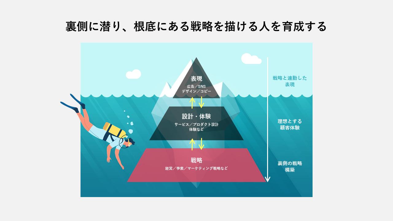 広告やSNS運用といった表面的な手段に飛びつくのではなく、戦略・戦術・実行をつなぐことができる人材が必要だと考えています。育成コンセプトを「氷山の裏側に潜れるマーケターの育成」としています。