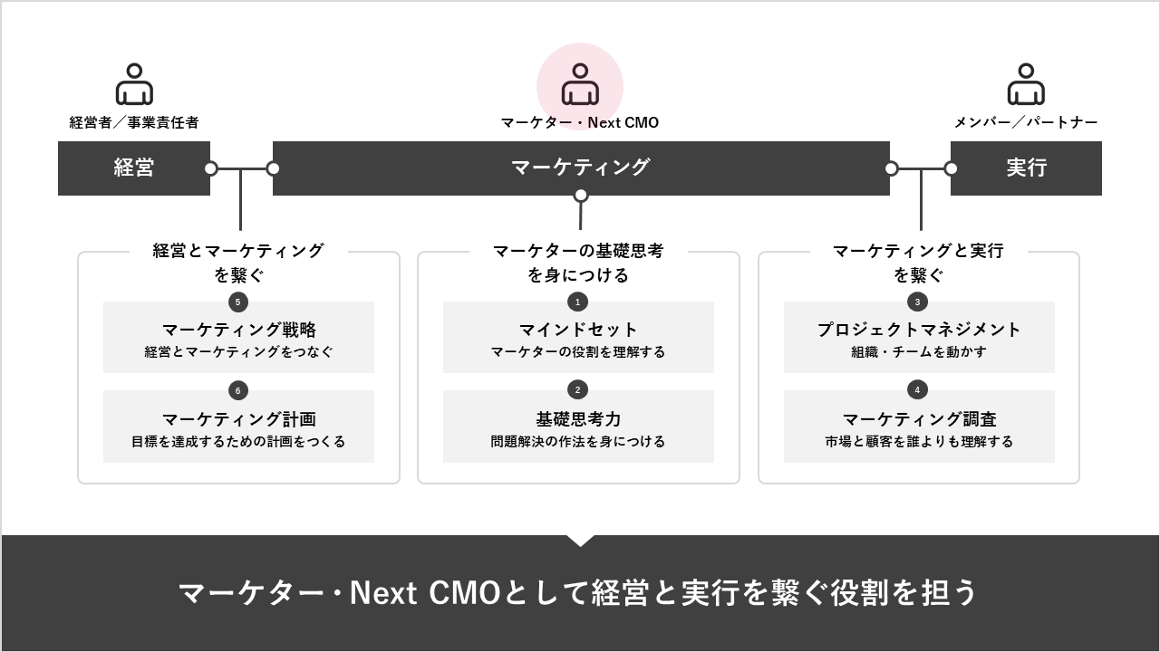 経営とマーケティングをつなぎ、未来の市場・顧客・組織を創るNext CMO育成を通じて、日本全体にマーケティングの力を浸透させていきます。
