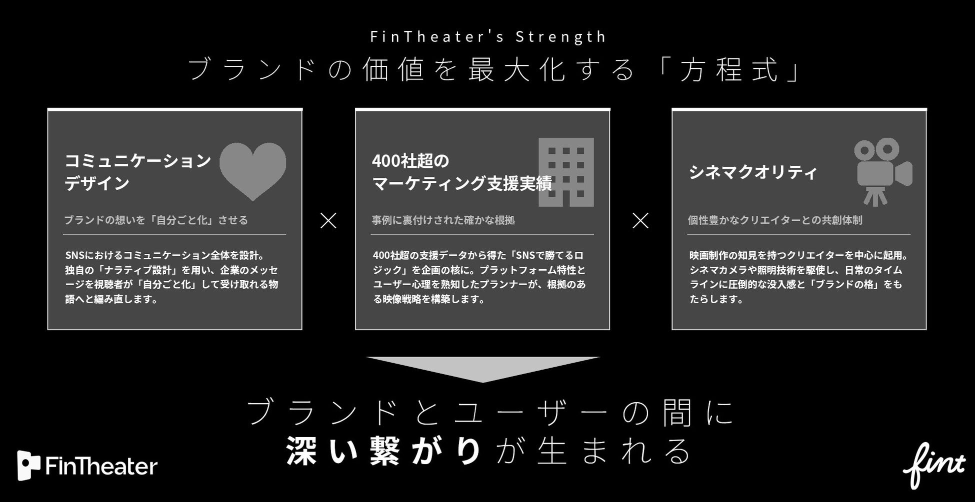 昨今のSNS市場では、動画が『どれだけ見られたか』以上に『どれだけ深く心に残ったか』という質が問われています。これまでSNS上では、数多くの動画が一過性の『バズ』で終わってしまう課題を抱えてきました。FinTheaterは、400社の支援実績に基づくロジックと、シネマクオリティを融合させることで、この課題の解決を目指します。戦略という確かな土台があるからこそ、クリエイターの感性はブランドの想いと深く共鳴し、その力を最大限に発揮できる。私たちはそう信じています。 作り手の個性を活かしながら、ブランドの哲学を視聴者の『自分の物語』へと翻訳し、消費されない『深い繋がり』を築いていく。私たちは、そんな体温のある表現を追求し続けます。