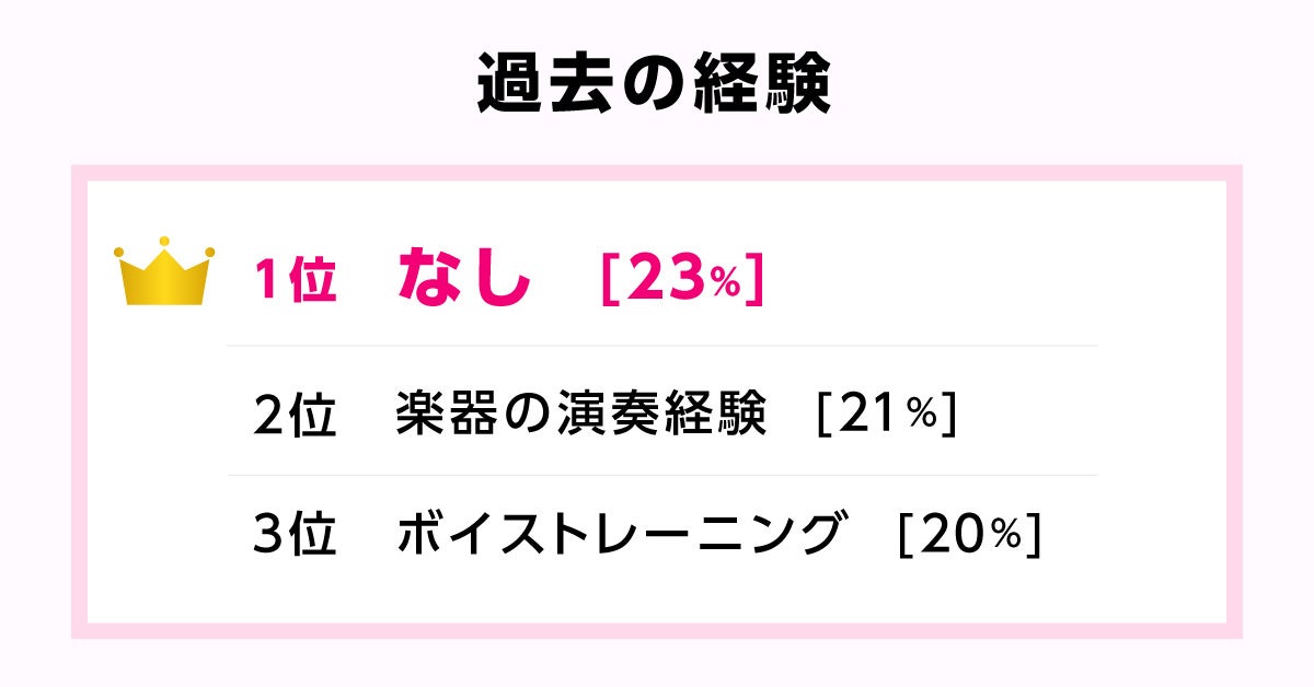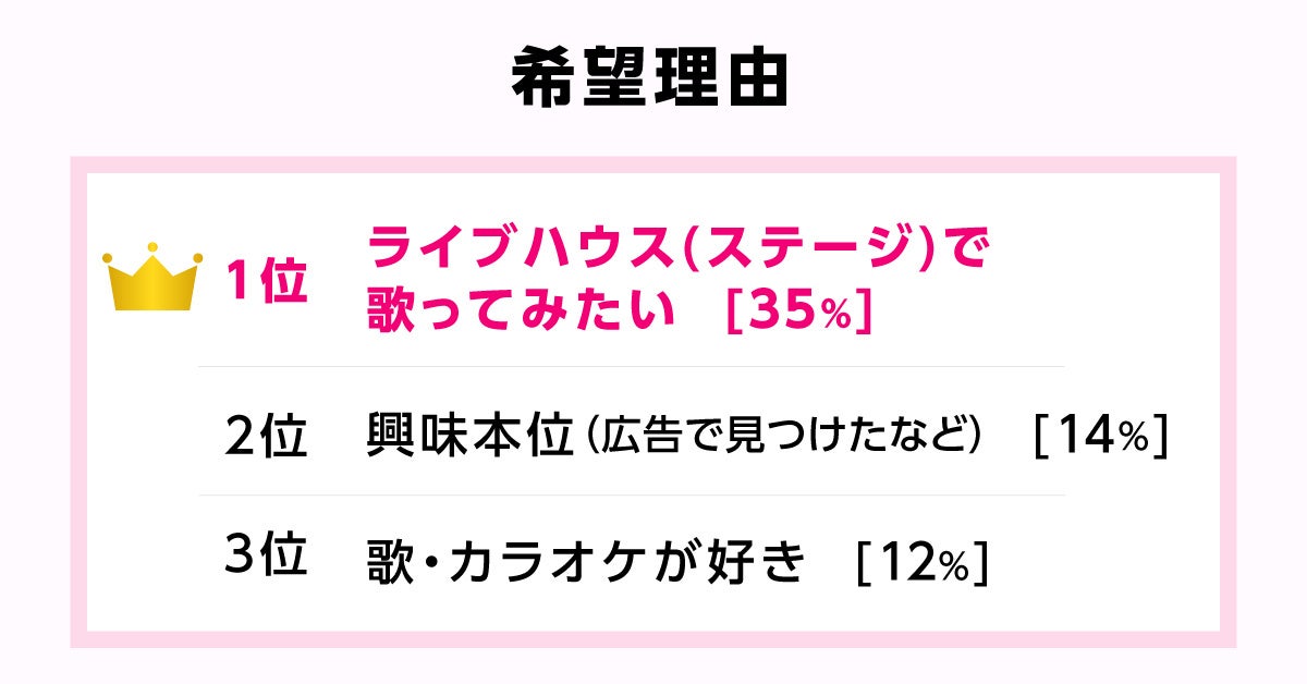 過去に音楽経験がなかった方からの参加が多く、一定数楽器の演奏経験・ボイストレーニングの経験者がいるものの、比較的ライト層の参加が多いと言えます。また、参加を希望した理由は「ライブハウス(ステージ)で歌ってみたい」という内容が最多。オープンマイクや生バンドカラオケなど、気軽にステージで歌えるイベントが増えてきている中で顔出しNGライブ体験も、新しい選択肢として考えられているのかもしれません。