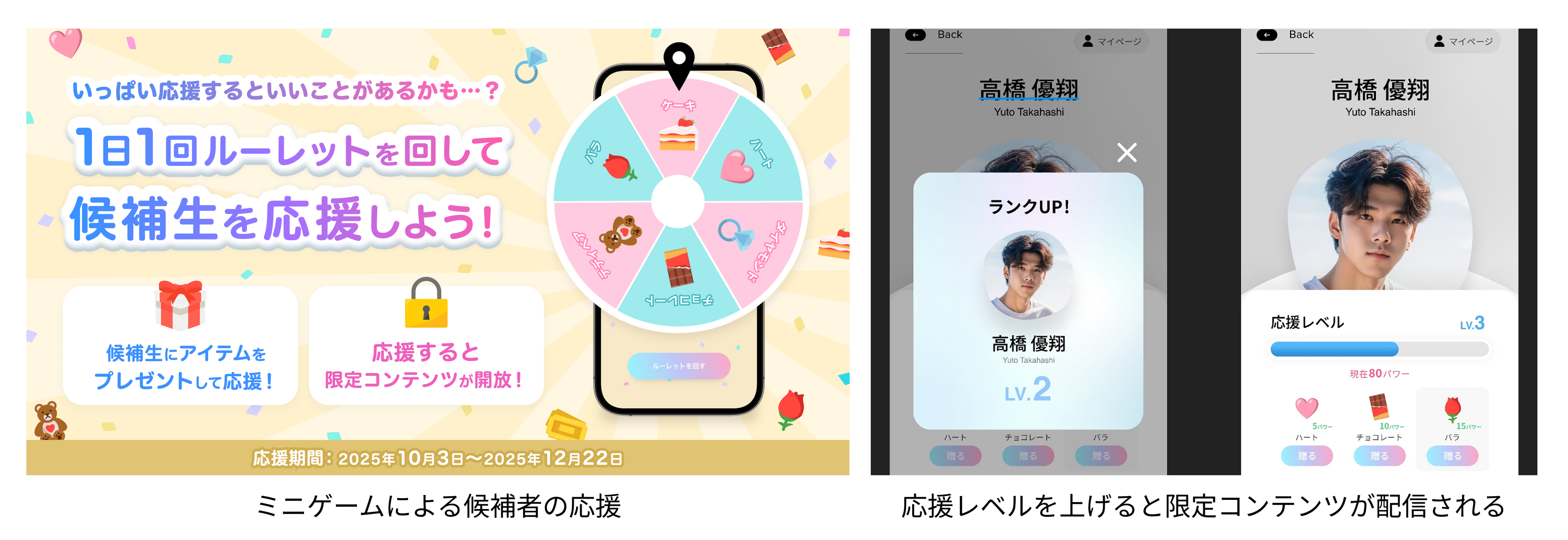 視聴者はLINEミニアプリ内の無料ミニゲームで獲得したポイントを使って候補者を直接応援。報酬としてLINE限定のコンテンツを受け取ることができ、応援の熱量を高めます。また、運営側はどの候補者がより多く応援を受けているかを把握でき、選考の参考データとして活用可能です。