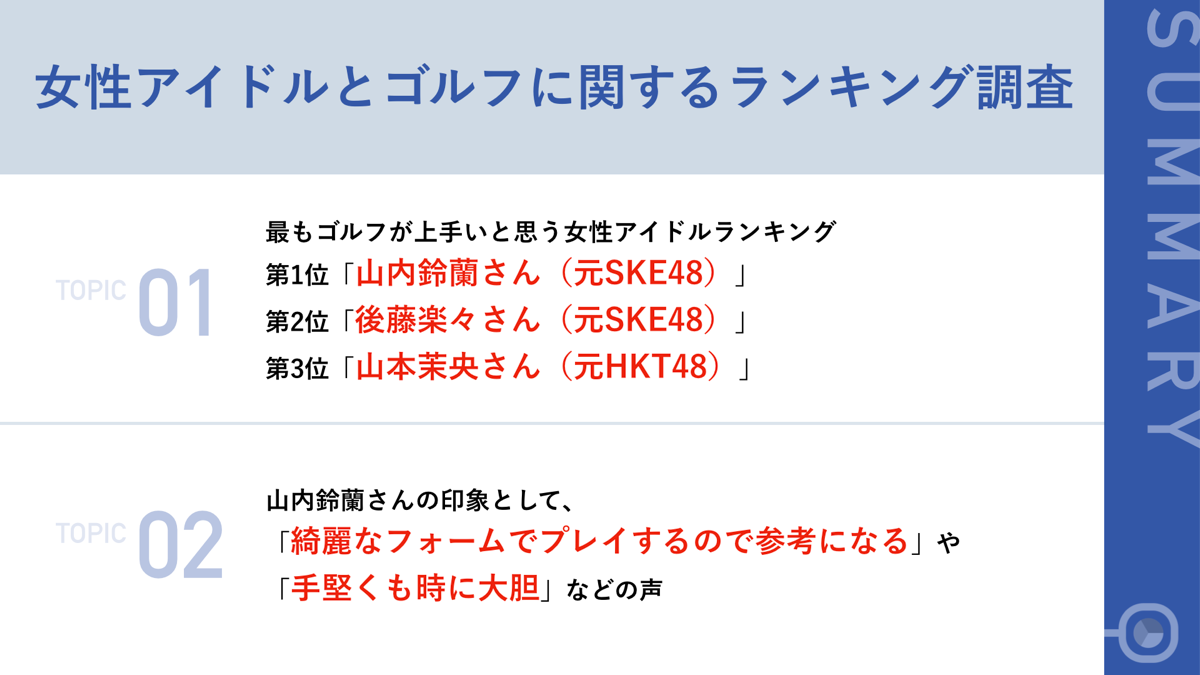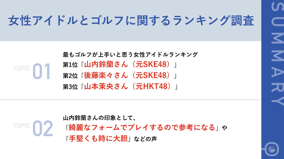 まず、ゴルフが上手いと思う女性アイドルについて聞いたところ、3年連続で第1位は「山内鈴蘭さん(元SKE48)」が選ばれました。第2位には「後藤楽々さん(元SKE48)」、第3位は「山本茉央さん(元HKT48)」と続いています。第1位の山内鈴蘭さんの印象には、「綺麗なフォームでプレイするので参考になる」や「手堅くも時に大胆」などの声が挙がりました。