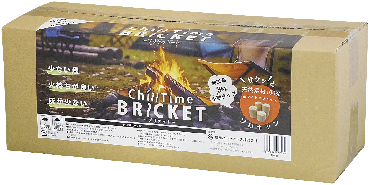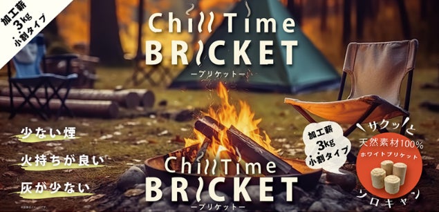 ブリケットは、天然無垢材の家づくりにこだわる綿半グループの綿半林業が製造しております。小割にしているので使いやすく、軽量で持ち運びもしやすい「Chill Time ブリケット(加工薪)3kg」は、ソロキャンプやアウトドア、ホームバーベキューでの利用にぴったりです。綿半各店にて順次発売開始、各種ECサイトでご購入できますのでぜひお試しくださいませ。
