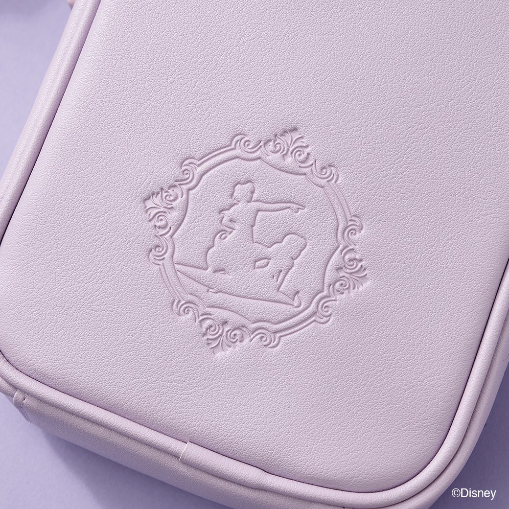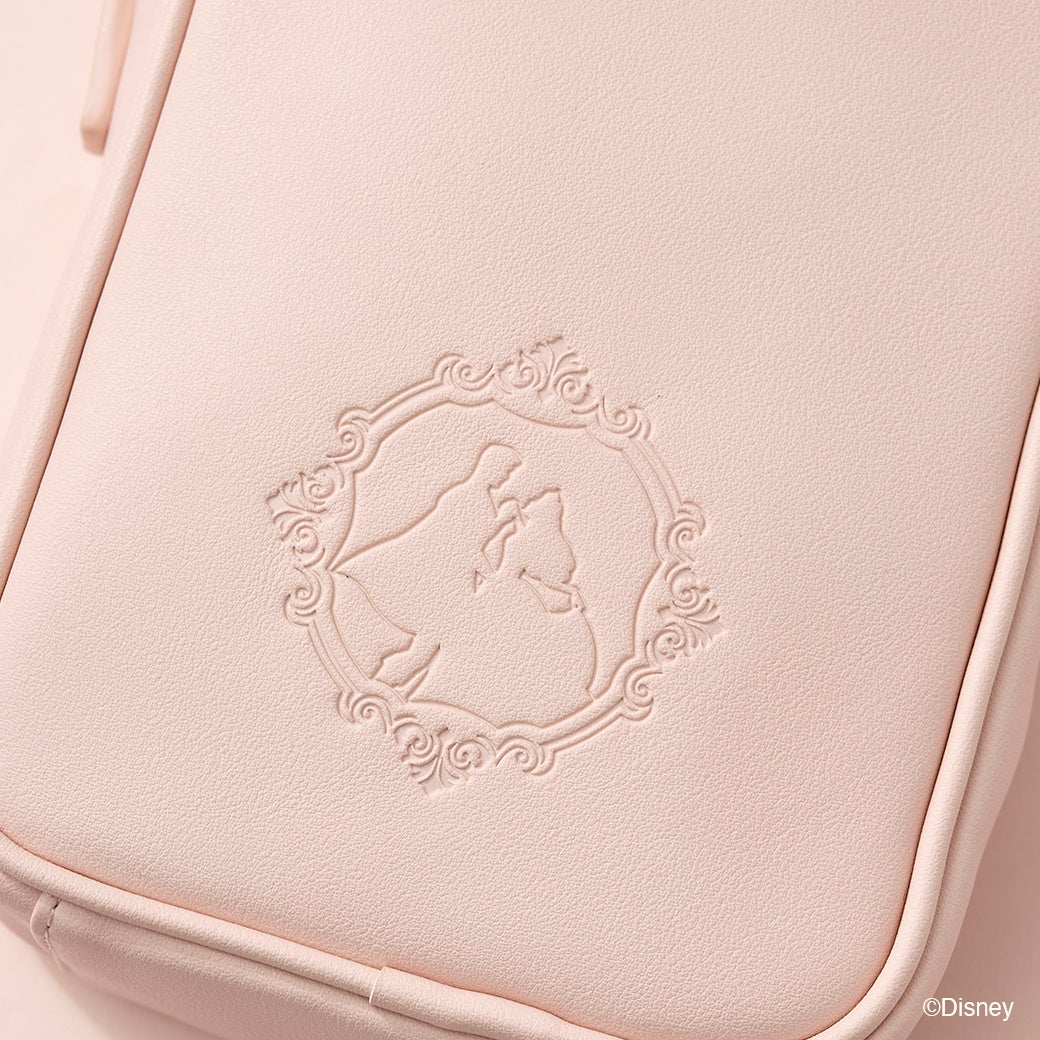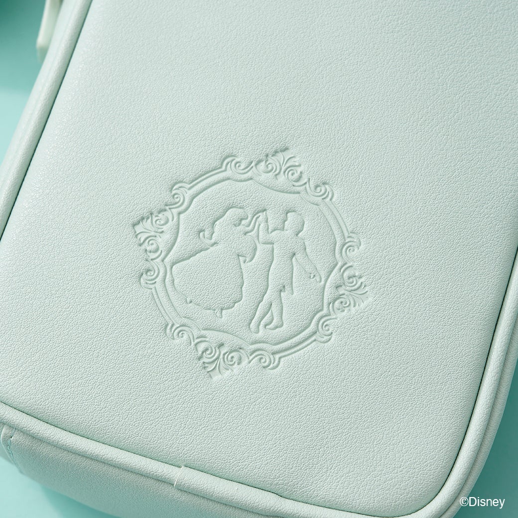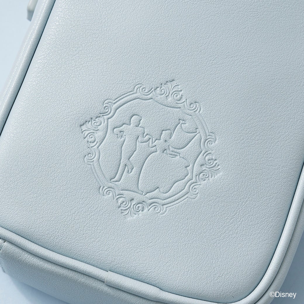 物語に出てくる「ガラスの靴」をモチーフにしたデザイン。ストーンには「シンデレラ」をイメージしたブルーのカラーを施し、世界観が広がるデザイン。王子様と手を取り合う、「シンデレラ」の姿が型押しに。