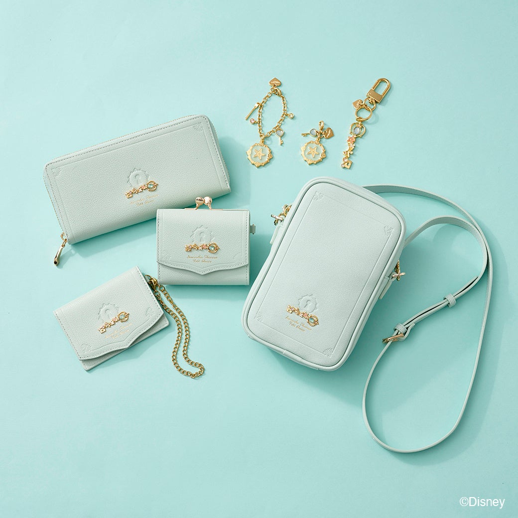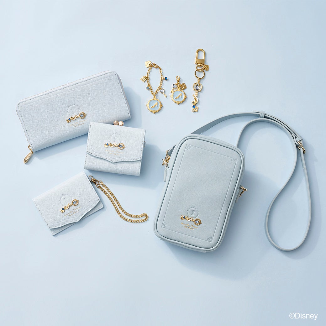 キーリングとしても使用可能な鍵モチーフのバッグチャームと「シンデレラ」をイメージしたガラスの靴や鍵のモチーフをデザインに落とし込んだチャーム。