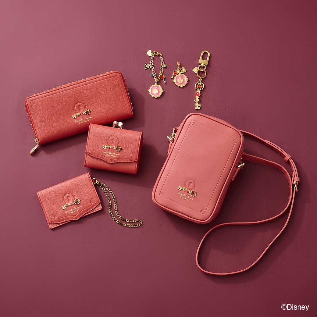 キーリングとしても使える鍵モチーフのバッグチャームと「白雪姫」をイメージしたリンゴやダイヤ、鍵のモチーフをデザインに落とし込んだチャームも展開。