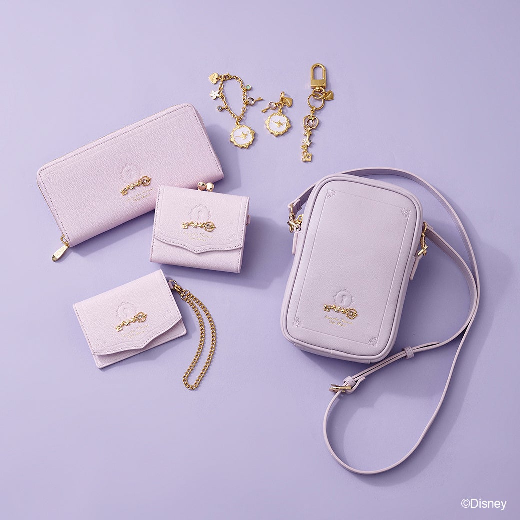 キーリングとしても使用可能な鍵モチーフのバッグチャームと「ラプンツェル」をイメージしたお花や鍵のモチーフをデザインに落とし込んだチャーム。