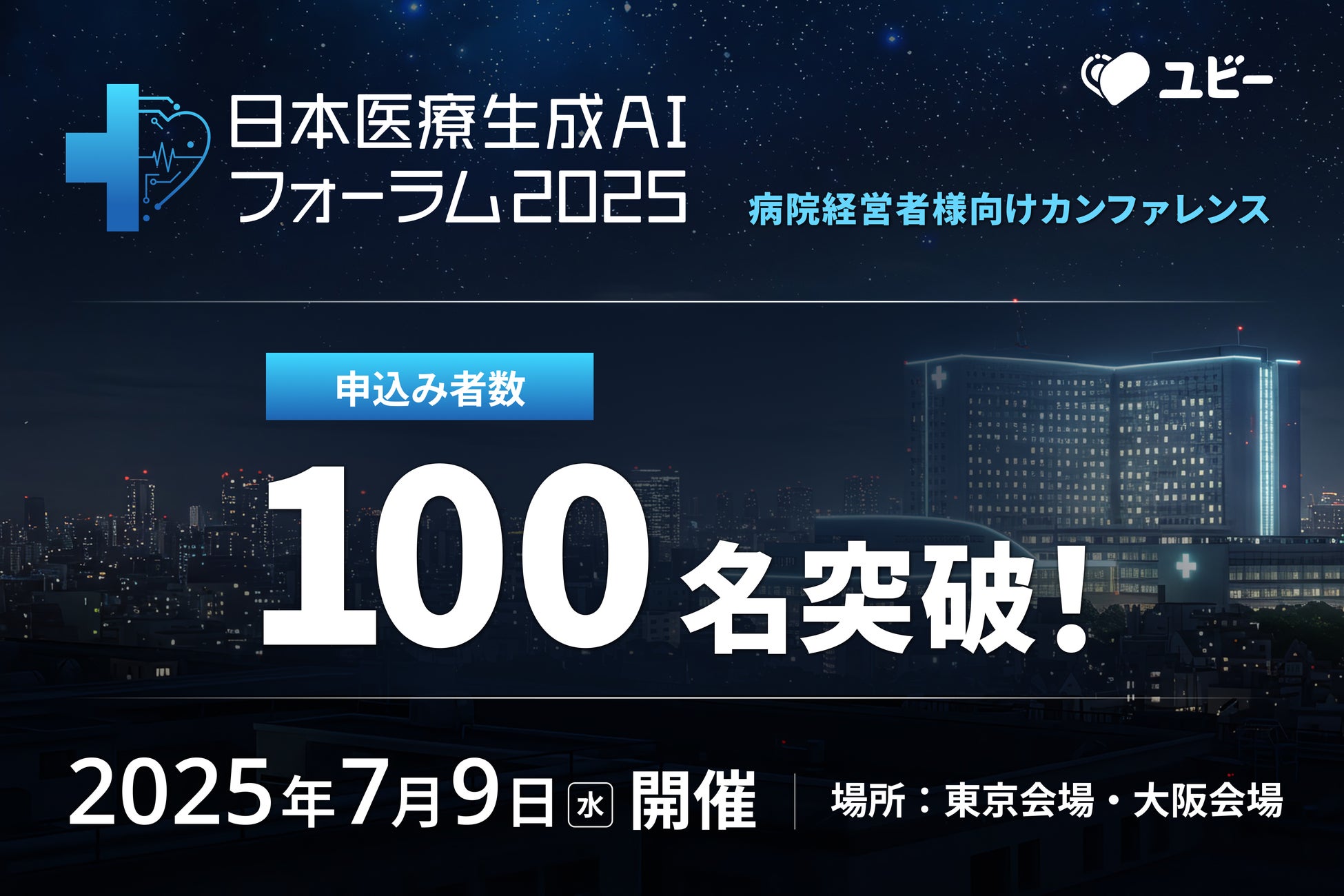 Ubie株式会社(本社:東京都中央区、共同代表取締役:阿部吉倫・久保恒太)が実行委員長として推進する病院経営者様向けカンファレンス「日本医療生成AIフォーラム2025」(2025年7月9日 東京・大阪にて開催)は、多くの病院経営者様よりご関心をお寄せいただき、この度、申込み者数が100名を突破したことをお知らせします。