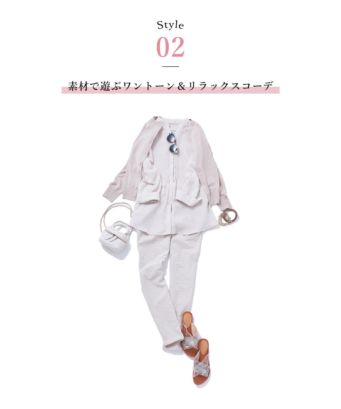 「いつもと少し違った印象にしたい時は淡いトーンでまとめたコーディネートがオススメ。淡いトーンでまとめる2 素材で遊ぶワントーン&リラックスコーデだけで今っぽく、リラックス感のある雰囲気に仕上がります。上に羽織ったカーディガンはほんのりシアーな感じも今の気分です。しかも!洗濯機で洗えるのでデイリーにも旅行にも重宝するはず。」