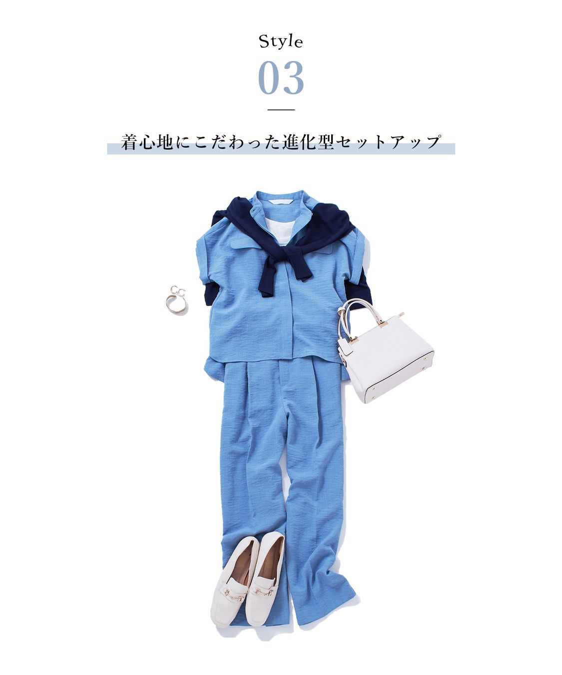 「春気分が一気に高まるブルーのセットアップは、シャリ感のあるリネンライク素材。「何を着て行こう?」と迷う日に「簡単に決まるセットアップ」は鉄板です。ハンサムに決まるワイドパンツに、ホワイトの小物を合わせれば爽やかさもUP!紫外線カットに加えて、さらっとした接触冷感の生地と機能面も抜群。」