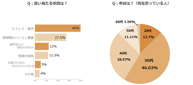 現在患っている人の年齢を見ていと30代、40代が他の年代に比べて非常に多く、丁度働きざかりのこの年代に多く見られることがわかります。 コロナ禍で在宅ワークが増え、以前とは異なる心労・また運動量が減っている上での長時間のPC業務などもあり、この病気にはそういった仕事に関わる要因が大きいことが伺えます。