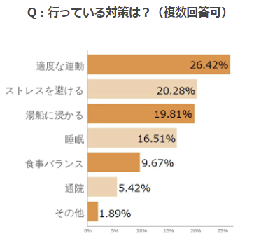 このように、対策の上位に来ているのはセルフで行えるものばかりで、通院の割合は5.42% に留まりました。