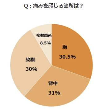 痛みを感じる箇所としては、胸・背中・脇腹とどれも同程度の割合でいるようです。複数箇所との回答は1割に満たず、多くの方は1か所のみの痛みで済んでいるようです。