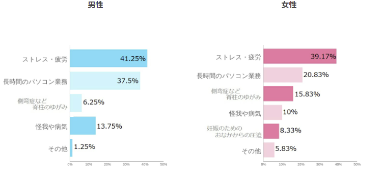 また男女別で見ると妊娠によるおなかからの圧迫が1割近く、妊婦さんの中でも割合この問題を抱えている人が少なくないことがわかります。