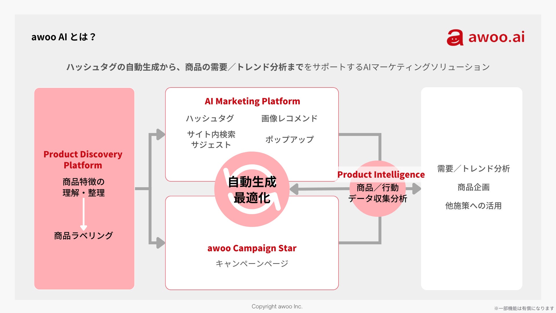 まず、Product Discovery Platformでは、AIがデータフィードの情報をもとに商品特徴の理解・整理を行い、商品をラベリングします。そして、AI Marketing Platformを通じてハッシュタグをサイト内に表示・随時最適化し、画像レコメンドやサイト内検索のサジェスト機能を提供します。さらに、新たに加わったawoo Campaign Starでは、商品データと顧客の行動データを組み合わせ、簡単に魅力的なキャンペーンページを作成・最適化することで、売上の最大化を図ります。これらの施策により得られるデータを、Product Intelligenceによって、収集・分析を行い、得られたインサイトを様々なマーケティング施策に活用することが可能です。