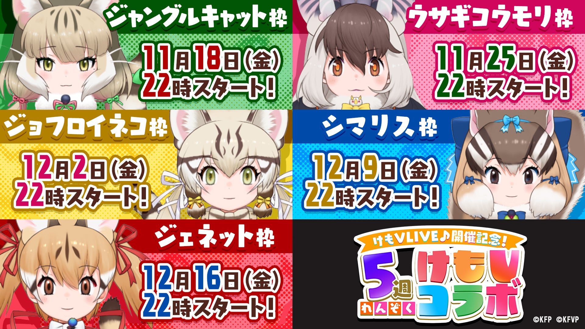 「けものフレンズプロジェクト」から登場し現在好評配信中のVtuber「けものフレンズVぷろじぇくと」。2022年12月18日(日)に決定している「けもV LIVE♪」開催記念!として、ジェネット、ジョフロイネコ、シマリス、ジャングルキャット、ウサギコウモリの5人によるコラボ配信企画を、11月18日(金)より5週連続に渡り実施することが決定。