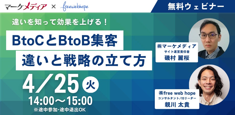 株式会社free web hope(本社:東京都中央区、代表取締役:相原ゆうき)は、無料のオンラインセミナー「違いを知って効果を上げる!BtoCとBtoB集客の違いと戦略の立て方」を4月25日(火)に開催いたします。