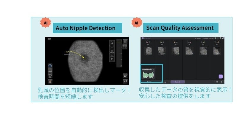 AI技術を取り入れた新しい機能*は、検査時に乳頭の位置を自動的に検出し、取得したボリュームデータの撮影範囲やスキャンの品質などを視覚的に表示します**。また、撮り忘れ防止のサポートや自動化による医療従事者への作業負担の軽減でスムーズな検査環境に寄与します。その他、ハードウエアの刷新でスキャン速度が従来より約40%***短縮し、検査時間の削減にも貢献します。