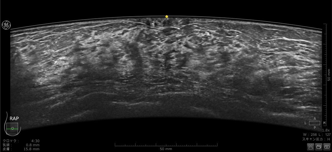 乳房にあてるプローブは、よりフィットするように設計され、周波数帯域も広がったことで空間分解能とコントラスト分解能が向上しています。全ピクセルにフォーカスがあたる信号処理、乳頭直下が見えやすくなる画像処理は刷新され、より均一性の高い画像を提供します。