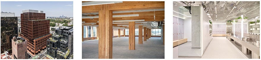 概 要 :豪州メルボルン市近郊コリンウッドに建つ地上15階、地下2階の木造オフィスです。地階から6階がRC造、7階から15階が木造の混構造で、竣工済みの木造オフィスとして豪州最高層※です。床版(しょうばん)に豪州産ラジアータパインのCLTを使用し、柱・梁はビクトリア州産材の集成材を現し(あらわし)仕上げで使用しています。卓越したオフィスデザイン、自然光を豊富に取り入れた開放的な空間、品質の高さ、建物の長寿命性などが評価され、最高評価のGoldを受賞しました。建築分野でGoldを獲得したのは3件のみです。