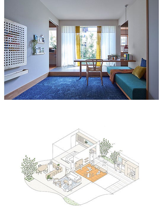 概 要:子育て世代の住宅向けに提案する小さな子どものための専用スペース。家の「まんなか」に位置しリビングやダイニングからいつでも子どもの見守りができます。周辺より床を一段下げてゆるやかに仕切った空間は子どもにとって基地(BASE)のような自分だけの居場所となり、自立心を育みます。子どもの成長に合わせて適切なタイミングで個室化も可能で、巣立った後はリビングとしての利用や趣味の部屋に変えるなど多彩な使い方ができます。