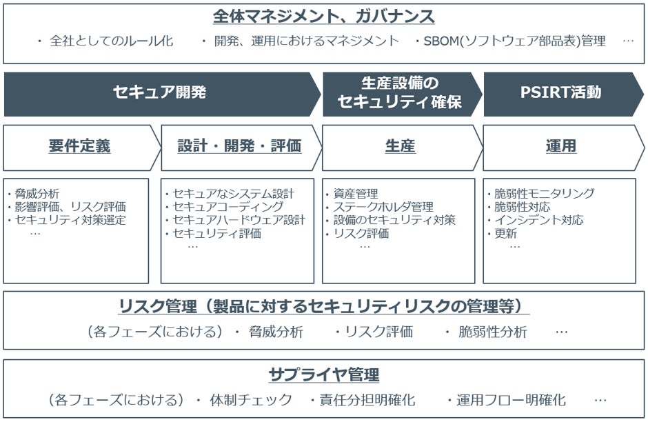 本サービスは、EUサイバーレジリエンス法をはじめ、EU機械規則[ii]、EU無線機器指令2022/30/EU [iii]、英PSTI法[iv]といった欧州IoTセキュリティ法規への準拠を支援します。これらの法規の中では、製品のライフサイクル全体でセキュリティに関する活動を導入することが求められています。例えばEUサイバーレジリエンス法においては、要件定義から運用フェーズを通して、脅威分析やリスク評価といったリスク管理のほか、体制チェックや責任分担明確化といったサプライヤ管理への対応が必要となります。各法規に準拠することで、事業者はサイバー攻撃に対して一定の耐性を有していることを対外的に説明することが可能になります。