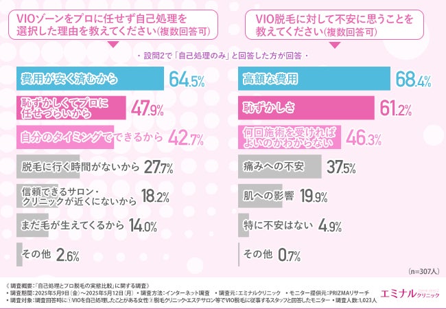 今回の調査で、VIOゾーンにおける処理方法の選択において、多くの女性が「費用が安い」「プロに見せるのは恥ずかしい」「自己都合でできる」といった要因から自己処理を選び続けている方がいることが明らかになりました。