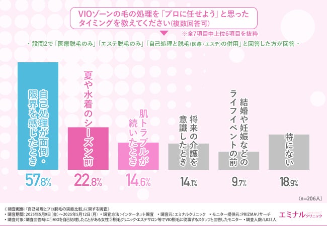 「VIOゾーンの毛の処理を「プロに任せよう」と思ったタイミングを教えてください(複数回答可)」と質問したところ、『自己処理が面倒・限界を感じたとき(57.8%)』と回答した方が最も多く、『夏や水着のシーズン前(22.8%)』『肌トラブルが続いたとき(14.6%)』となりました。