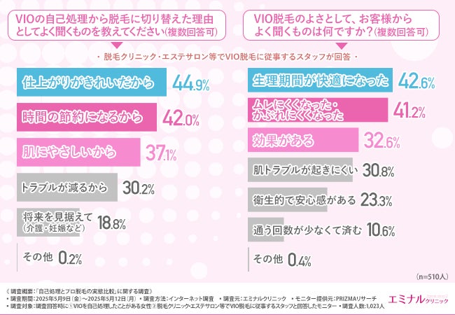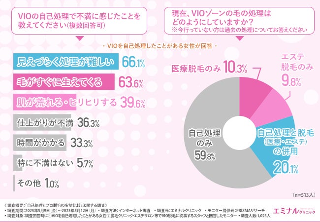 そこで今回、医療脱毛の「エミナルクリニック」は、①VIOを自己処理したことがある女性②脱毛クリニック・エステサロン等でVIO脱毛に従事するスタッフを対象に、「自己処理とプロ脱毛の実態比較」に関する調査を実施しました。