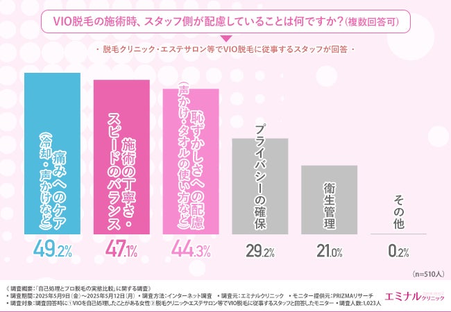 「VIO脱毛の施術時、スタッフ側が配慮していることは何ですか?(複数回答可)」と質問したところ、『痛みへのケア(冷却・声かけなど)(49.2%)』と回答した方が最も多く、『施術の丁寧さ・スピードのバランス(47.1%)』『恥ずかしさへの配慮(声かけ・タオルの使い方など)(44.3%)』となりました。