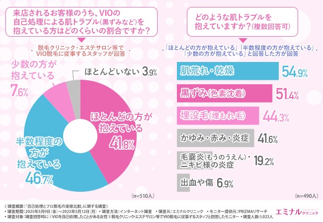 また、スタッフ側の視点からも、自己処理による肌トラブルの深刻さが認識されており、来店者の9割近くが何らかの問題を抱えているという結果は、自己処理リスクの裏付けともいえるでしょう。