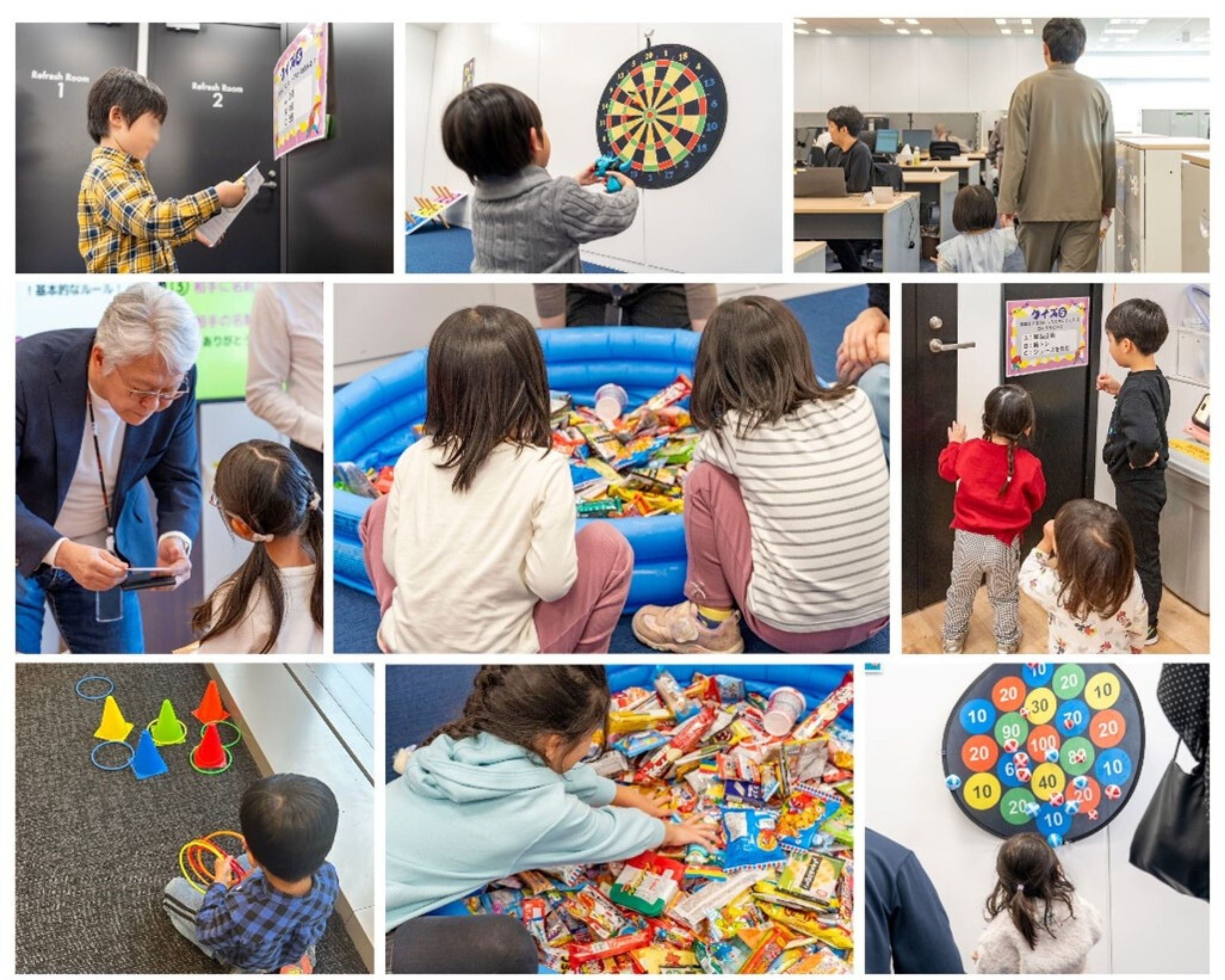 ファミリーデーは、従業員のご家族・パートナーが当社について理解を深めることができるほか、従業員のエンゲージメント向上につながる貴重な機会です。イベント冒頭では、当社の歴史や社内行事を紹介する映像を上映し、参加されたみなさまに当社のことを知っていただきました。その後、代表取締役の榮と子どもたちが名刺交換を行ったほか、普段見ることのできない職場を見学できるクイズスタンプラリー形式のオフィス探索、軽食を囲みながら豪華景品が当たるビンゴ大会を開催しました。ほかにも、的あてや輪投げ、お菓子の掴み取りを企画し、キッズスペースも充実させるなど、従業員の家族とパートナーをもてなす1日となりました。