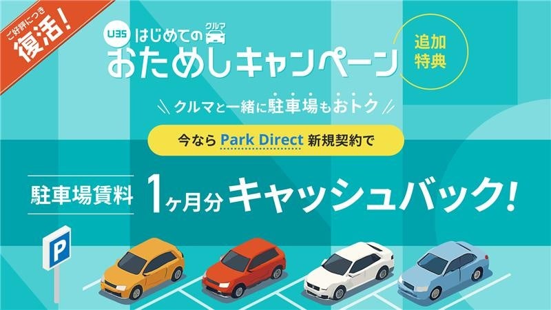 「【U35】 はじめてのクルマ おためしキャンペーン」をご利用中、またはこれからご利用のお客様が、期間中に「Park Direct」で駐車場を新規契約されますと、駐車場月額賃料1カ月分をキャッシュバックいたします。